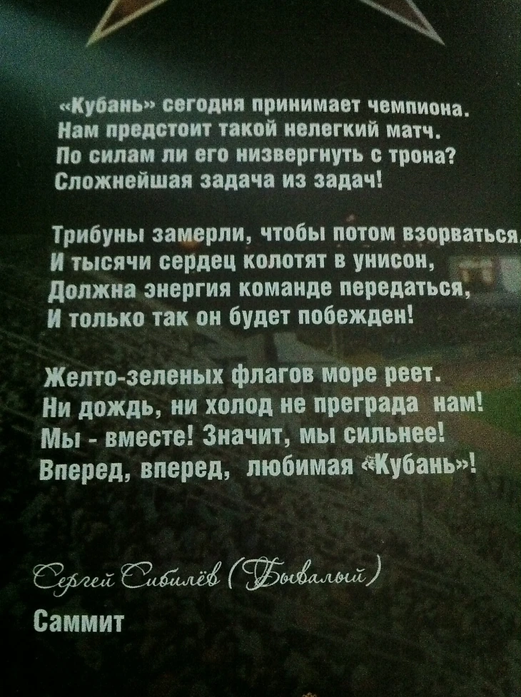 Клуб болельщиков «Кубани», носящий имя «Саммит», предварил игру с ЦСКА пылким стихотворением, помещенном на последней странице программки.