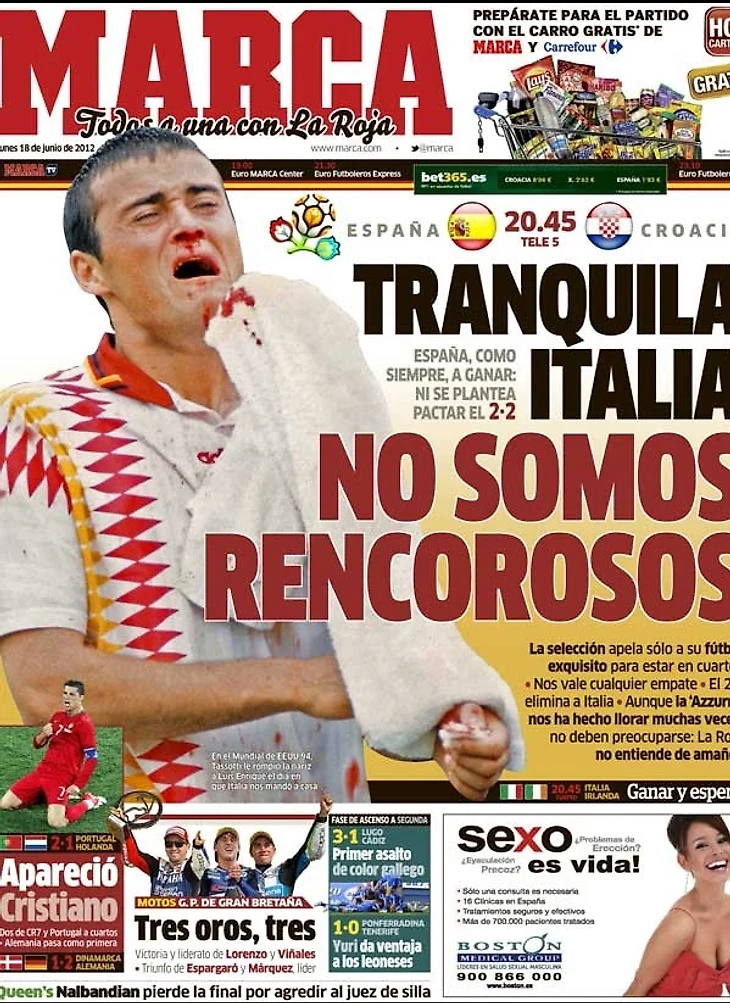 Как известно, на турнире в Австрии и Швейцарии Испания взяла желанный реванш, но на этом история использования фотографии Энрике не закончилась. На Евро-2012 две враждующие сборные попали в одну группу, и выход Италии в плей-офф зависел от успеха Испании в матче с Хорватией. В день игры Marca снова поместила окровавленного Лучо на обложку, но на этот раз выбрала примирительный заголовок: «Спокойно, Италия, мы больше не обижаемся». Команда Висенте Дель Боске обыграла хорватов, а в финале снова встретилась с итальянцами, которых беспощадно разнесла в Киеве.