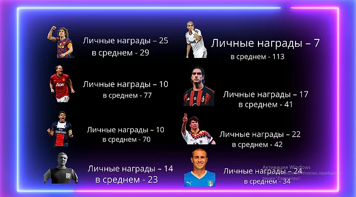 Лидирует в списке наград Карлес Пуйоль, испанец 6 раз входил в символическую сборную евросезона, 3 раза в сборную мира, а также он удостоен премии «Golden Foot» в номинации «Легенды Футбола», но индивидуальных призов такого лавра, как у Маттеуса и Каннаваро, у Пуйоля, к сожалению, нету. Оба стали обладателями Золотого Мяча после побед их сборных на Чемпионате Мира: Лотар – в 1990, Фабио – в 2006, став последним центрбеком с главным индивидуальным призом. Всё-таки учитывая значимость Золотого Мяча, в те годы уж точно абы кому не давали, засчитаем «Ballon Dor» как за 10 наград, в результате получается вот такая картина.