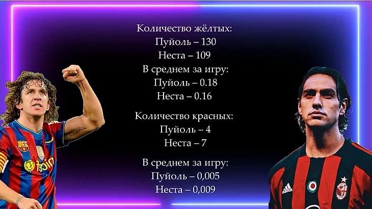 Капитан «Барселоны» получил за всю карьеру 130 жёлтых, у Несты на 21 меньше, но зато итальянец опережает своего оппонента по количеству красных (7 против 4 у Карлеса). Но в целом это очень мало для позиции центрдефа, поэтому за заслуги честной и чистой игры обоих наградим баллами.