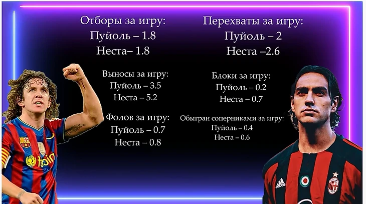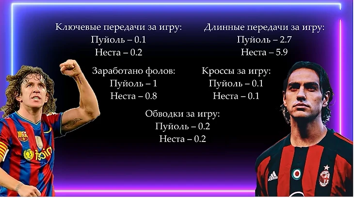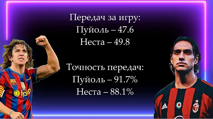 Неста отдаёт на 2 передачи больше за матч, чем Пуйоль, но зато Карлес выступал за «Барселону», в которой умели играть в пас даже медработники, поэтому неудивительно, что на пару процентиков испанец впереди своего визови.