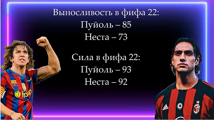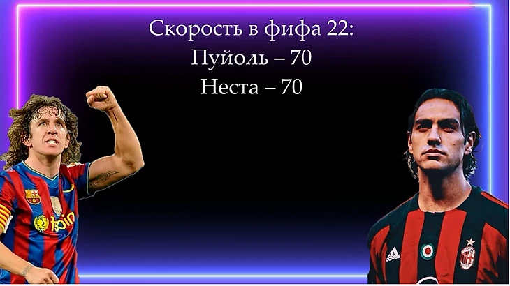 В «Фифа 22» оба имеют одинаковый рейтинг скоростных рывков. Да, он не самый высокий, но всё же и Пуйоль, и Неста брали своё отнюдь не быстротой бега. Ничья 1:1 по итогам тура.
