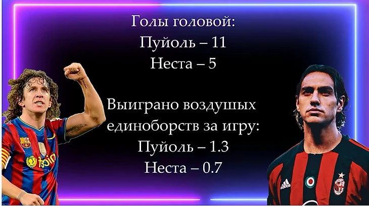 Всего за карьеру испанец наколотил 11 мячей со 2-ого этажа, Неста лишь 5, да и по выигранным верховым дуэлям почти двукратное преимущество капитана «Барселоны».