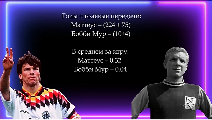 Сегодня в рамках рубрики «Символическая сборная всех времён» за право считаться лучшим центральным защитником в истории поспорят легенды 20 века: Лотар Маттеус и Бобби Мур. Параметров сравнения будет всего 5, ибо расширенных цифр по футболистам 20 века попросту нету. Очки начисляем по правилу национальных чемпионатов. Победителю – всё, проигравшему – ничего, при ничьей – каждому по баллу. Начинаем 2-ой полуфинал. ЛОТАР МАТТЕУС ПРОТИВ БОББИ МУРА. Поехали.