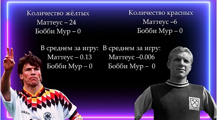 У Маттеуса набрались 24 жёлтые и 6 красных квадратиков. Нельзя сказать, что он отличался грубостью, но затмения иногда случались. Так, к примеру, в товарищеской игре с Австрией Маттеус за оскорбление судьи был выгнан с поля, а его команда пропустила 3 безответных мяча, уступив 1:4. За сверхнадёжную игру наградим 3 баллами Бобби Мура.