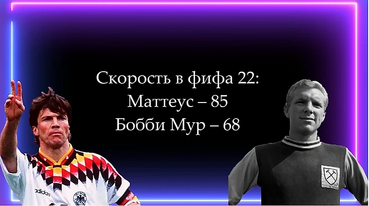 По видеонарезкам игры Лотара и Бобби напрашивается один единственный вывод - немец гораздо быстрее англичанина, всё-таки низкий центр тяжести и невысокий рост помогали обладателю Золотого Мяча легко убегать с мячом от преследователей. Мур же более грузный защитник, скорость точно не его конёк. К слову, также считают и в редакции игры ФИФП, отдавая заметное преимущество Маттеусу, поэтому именно он побеждает в данном аспекте.