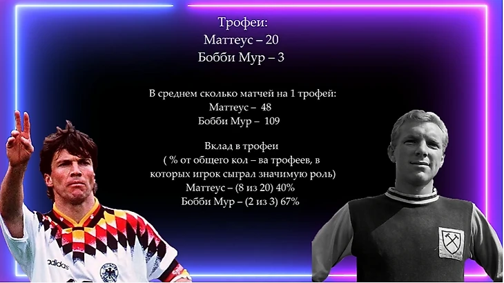 Бобби Мур в свою очередь тоже Чемпион Мира, он сумел войти в тот «золотой состав», который добыл для родоначальников футбола 1-ый и единственный по сей день международный трофей, причём Бобби ещё стал и одним из героев финала того мундиаля, записав на свой счёт аж 2 ассиста. Поэтому как футболист, влияющий на результат своего «сквада», Мур куда более предпочтительнее Маттеуса (67% титулов при непосредственном участии английского дефа).