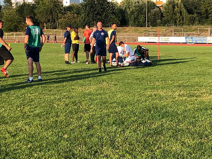 Затем тренер более подробно показывал нам упражнения, которые он объяснял детям, но уже на площадках для взрослых. Мы немного потренировались, а потом произошел не очень приятный случай: во время одного из упражнений один из участников неудачно подкатился под мяч и получил открытый перелом ноги. Поэтому занятие пошло немного не по плану, но тренер быстро вызвал скорую помощь, помощь приехала через 10 минут прямо на поле и забрала парня в госпиталь.