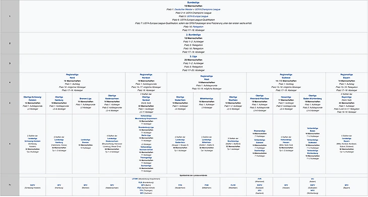 В качестве небольшого ликбеза немного о структуре футбольных лиг в Германии: (извиняюсь за картинку с Википедии, не нашёл хорошего скриншота структуры лиг у себя в презентациях)