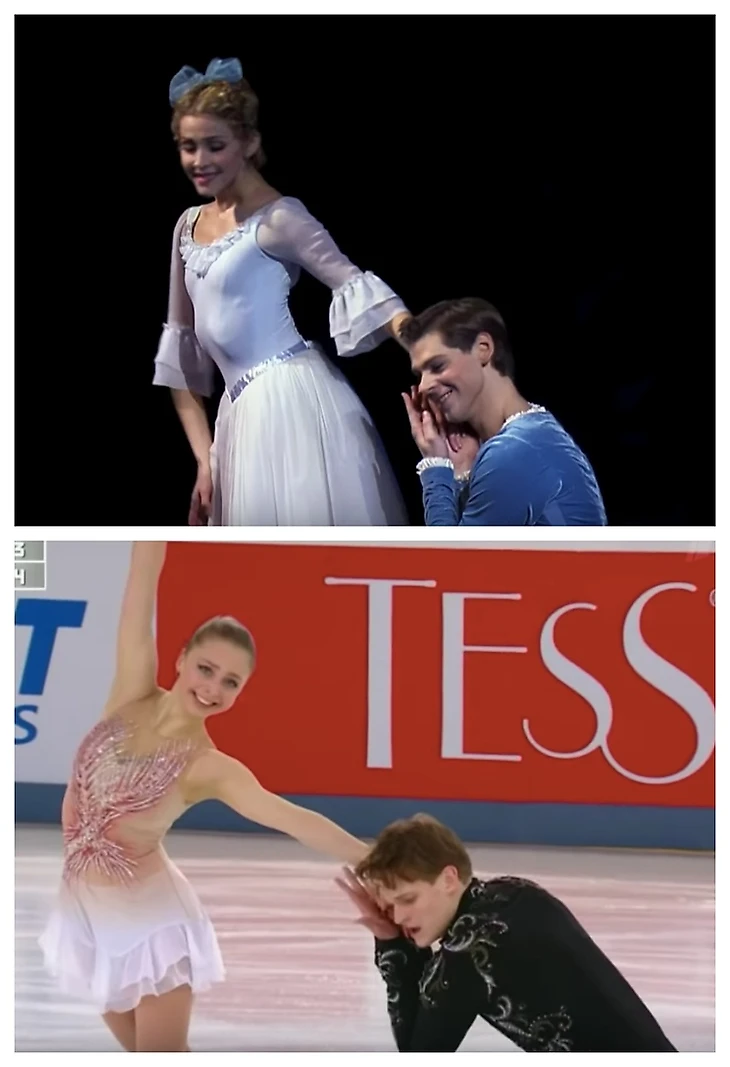 Первая треть спектакля на музыку па-де-де (вплоть до 1:28 на видео, приведенном ниже) включает в себя два прыжковых элемента: тройной сальхов и каскад 3-2-2 тулупами. Наш достойный ответ балетным дубль тур анлерам.