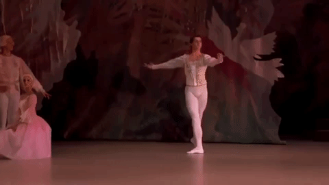 И начинается сразу с па-де-де. Начальная поза, особенно у партнера, конечно, совершенно балетна: классическая 4ая позиция рук (правая красиво вытянула вверх, левая — в сторону), только у правой руки вместо закругленной позиции (arrondi) — удлиненная (allongé).