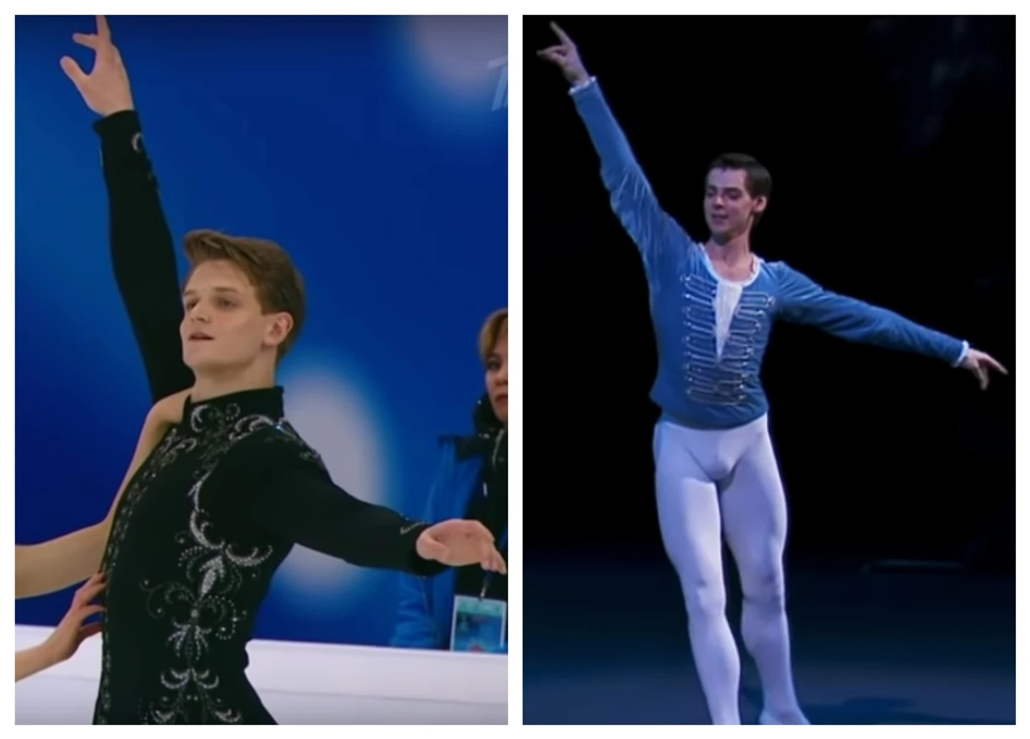 Здесь же располагаются и наиболее эффектные в динамическом плане элементы программы — еще один выброс и две самые «дорогие» поддержки. Особенно эффектны и эффективны в плане подчеркивания динамической волны две поддержки: обе делаются в кульминационной фазе музыкального развития, на вершине (или около) мелодической волны. Конечно же, опытные любители балета сразу опознают здесь балетные аналогии, ведь в классической постановке Мариинки (в версии Василия Вайнонена) эта музыка также сопровождается эффектными поддержками. В приведенном ниже видео поддержки из программы Бойковой-Козловского и поддержки из балетной версии совмещены вместе для удобства сравнения: