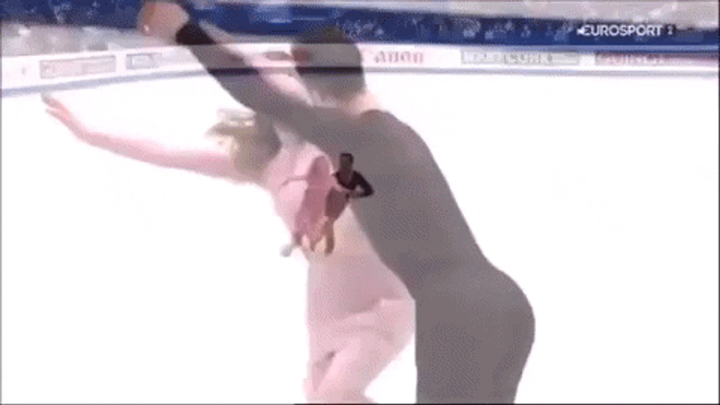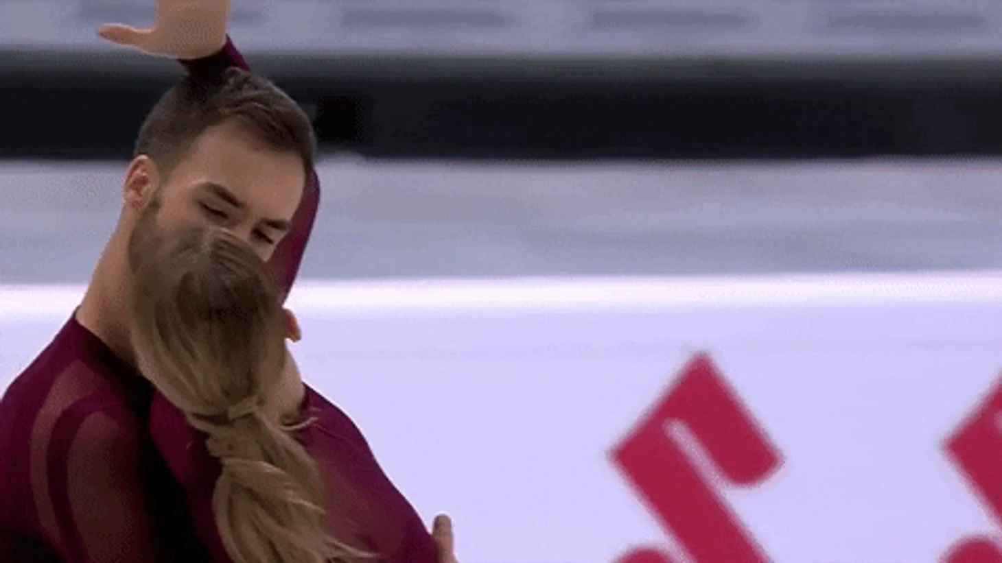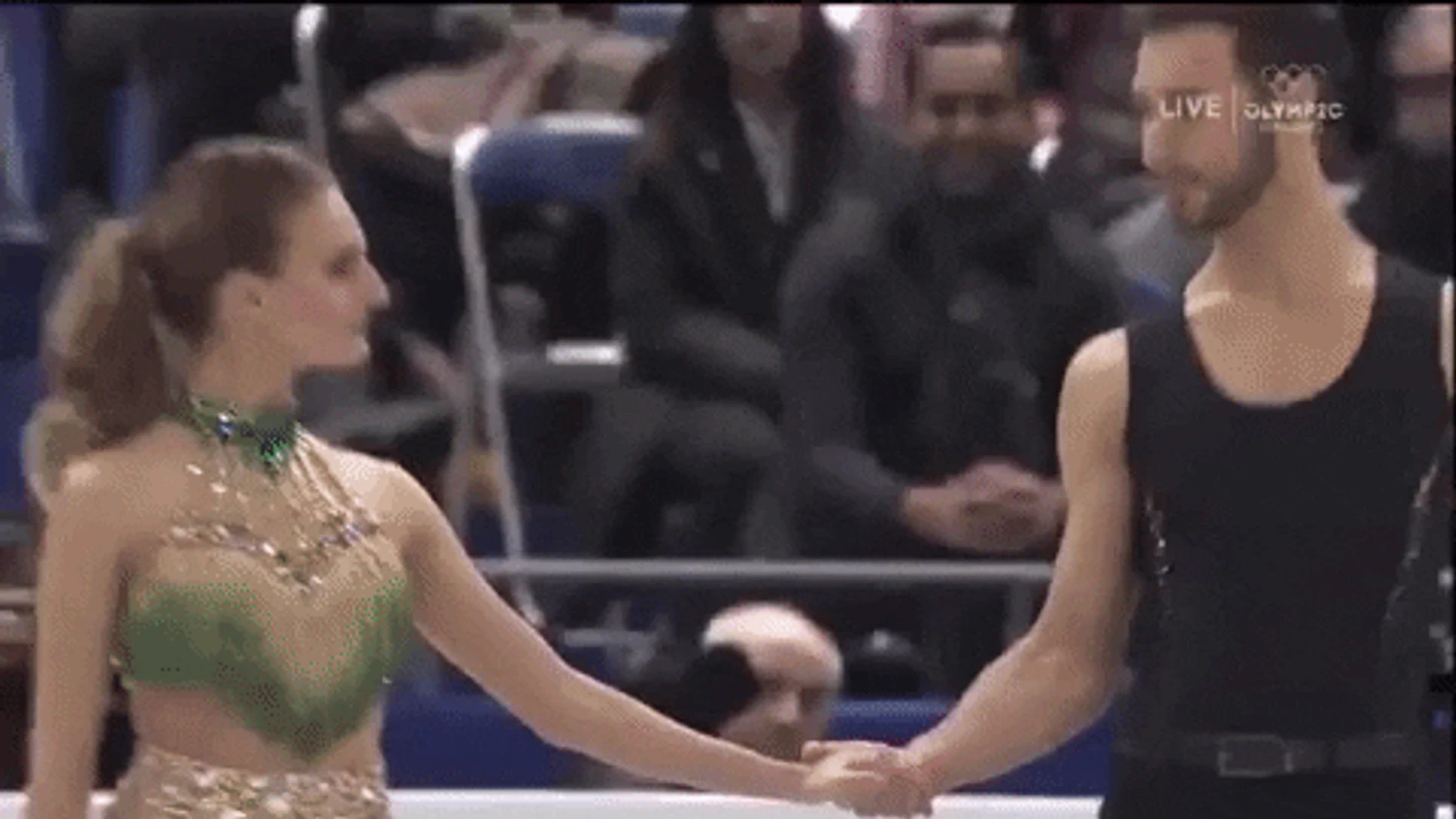 Длительный напряженный визуальный контакт — важный мотив танцев Габи и Гийома. Этот мотив, как правило, начинает звучать еще на раскатке, в момент объявления пары