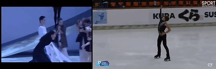 Сам же фигурист в этот момент «воюет» — в метафорическом, конечно, смысле — с, пожалуй, главным немезисом своей карьеры: четверным сальховом… И приземляет его ровно в тот момент, когда Тибальт узнает своего главного врага и достает шпагу.