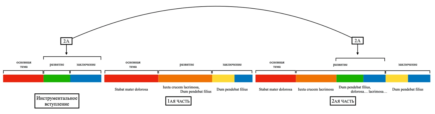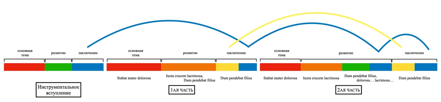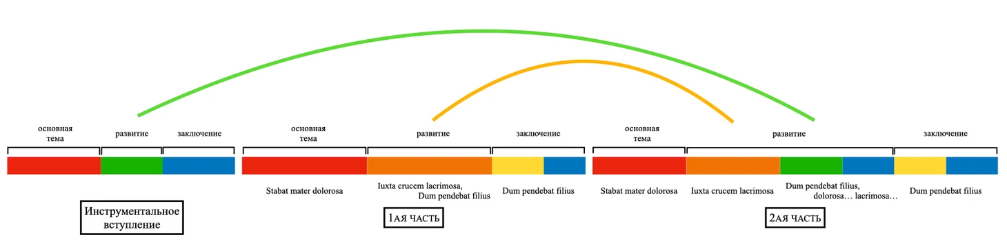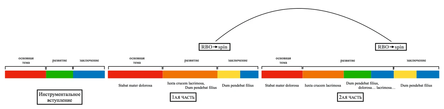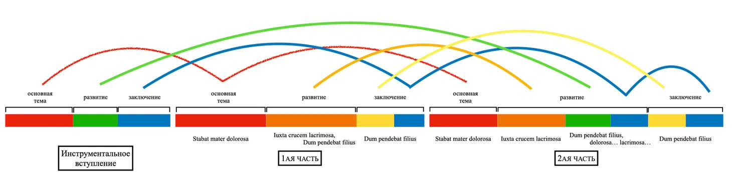 Итого, в этой структуре можно выделить несколько уровней взаимодействия материала. То, что объединяет все части — это начальные построения и концовки; вступление и вторая часть (но не первая!) объединяются общим «серединным материалом» (зеленый+синий комплекс); а две основные части (но не вступление!), в свою очередь, помимо прочих соответствий, объединяются общим материалом заключительного построения (желтый+синий комплекс).