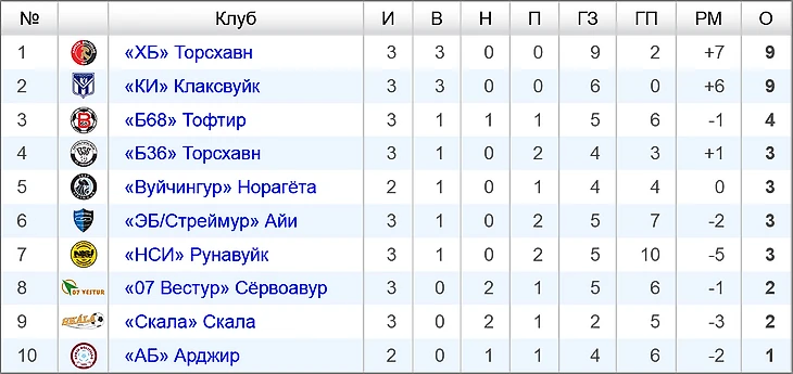 Турнирная таблица фарерской премьер-лиги