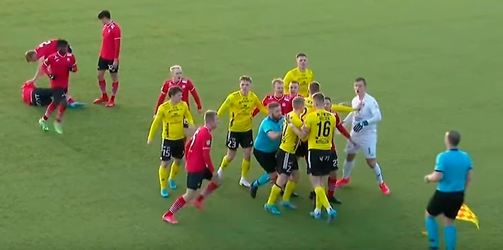 В первую добавленную минуту Нильсен отпустил мяч слишком далеко от себя. Увидев, что Боарур Йенсен успеет к нему первым, форвард рунавуйчан пошёл в подкат, пришедшийся точно в ногу игрока «Б68». Инцидент прекрасно видели несколько футболистов тофтирцев, сразу же отправившихся выяснять отношения с 16-м номером «НСИ». Разняв начавшуюся потасовку, судья Арон Софус Вест принял решение удалить Нильсена. Также за излишнее буйство получил "горчичник" вратарь «Б68» Роуи Хенце. Без ударного форварда рунавуйчане так и не смогли предпринять новых попыток штурма тофтирских ворот. После финального свистка на поле ринулись десятки болельщиков «Б68»: тофтирцы одолели соседей из «НСИ» впервые за десять лет!
