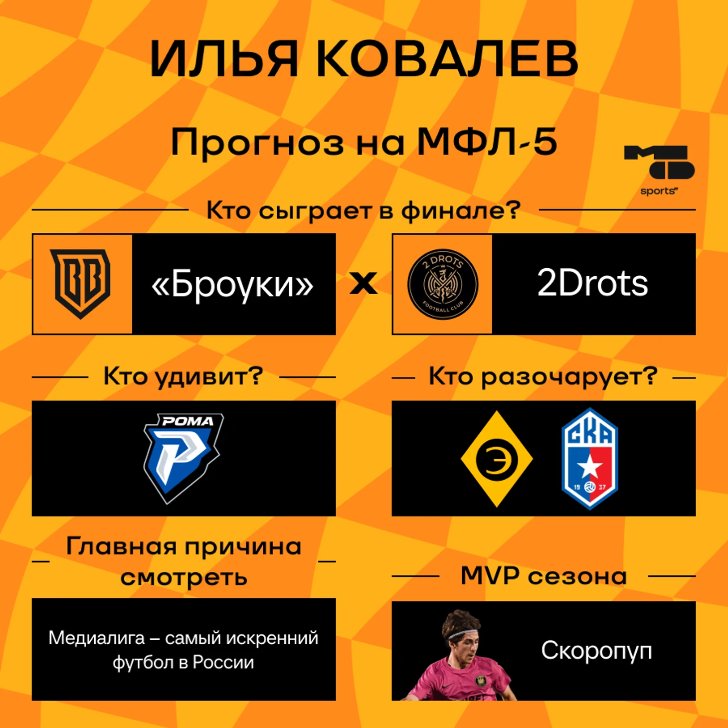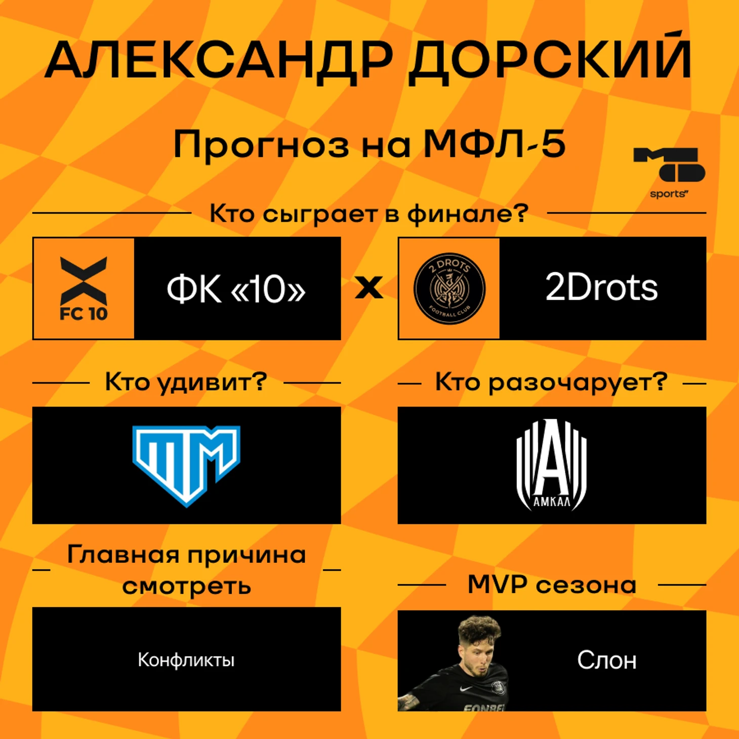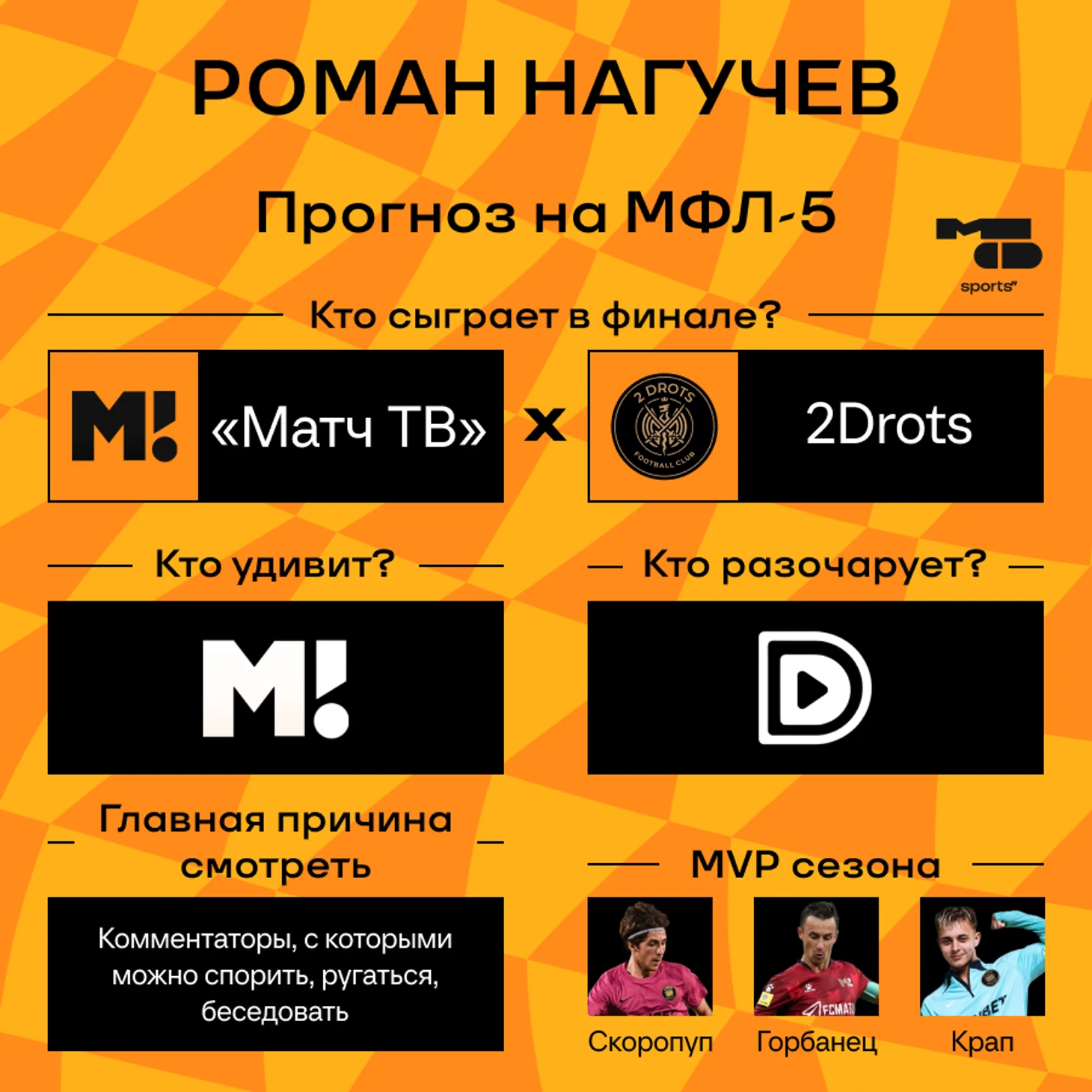 Предскажу в финале нашу команду против 2Drots. Поскольку игры «Матч ТВ» – 2Drots не было в МФЛ-4, то нужно это компенсировать.