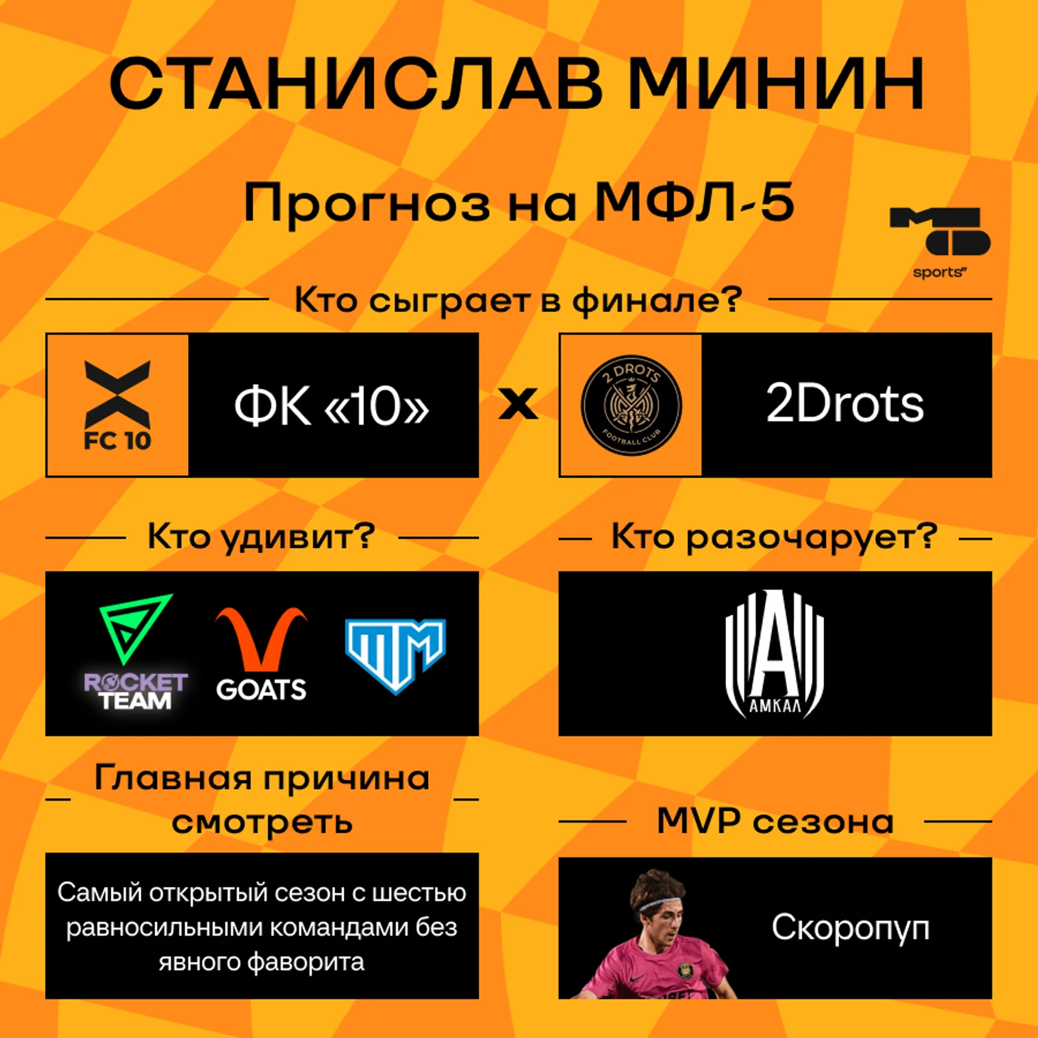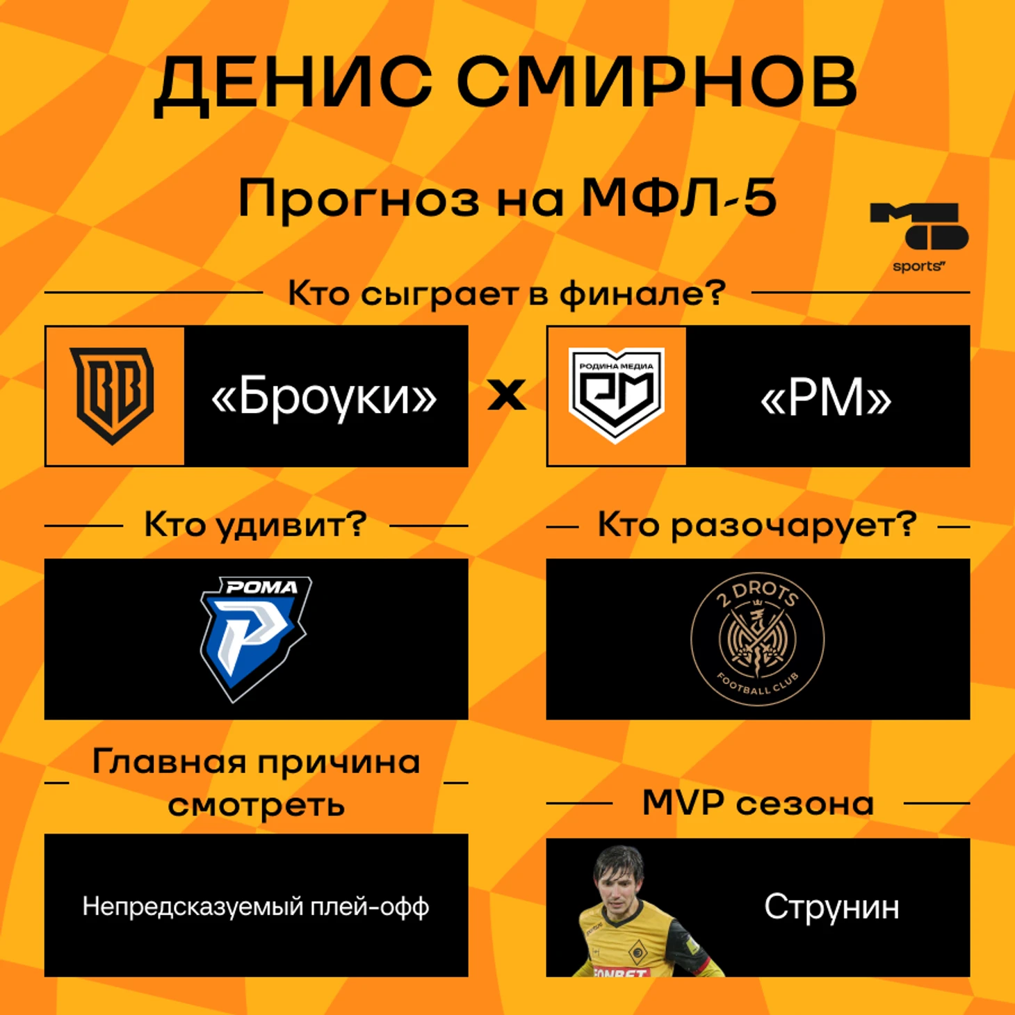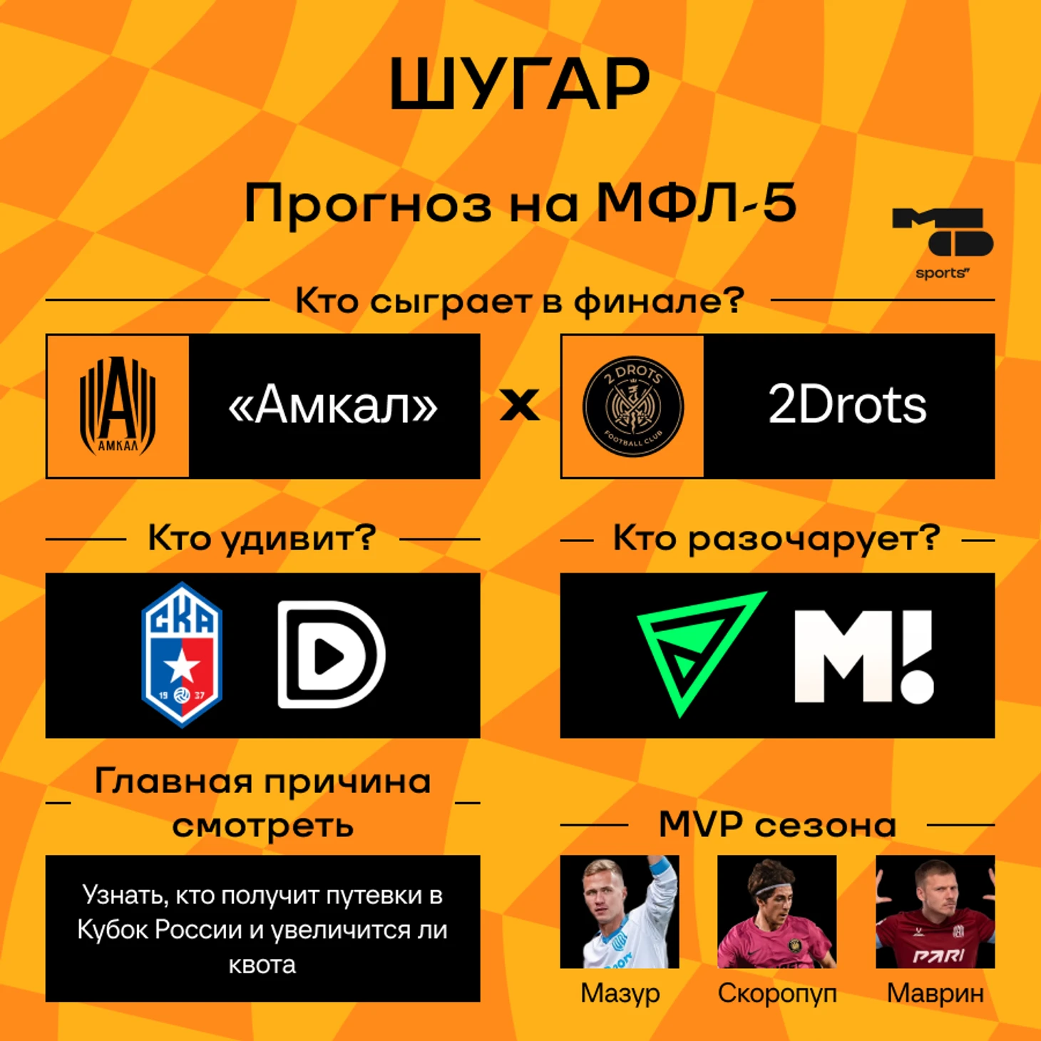Предскажу в финале нашу команду против 2Drots. Поскольку игры «Матч ТВ» – 2Drots не было в МФЛ-4, то нужно это компенсировать.