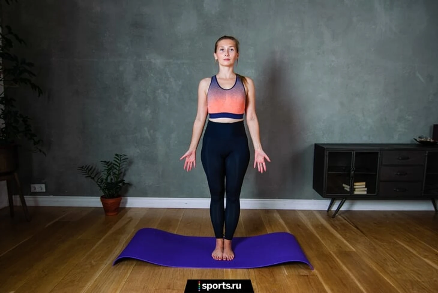 Встаньте прямо, ноги должны быть на ширине плеч, стопы вместе. Распределите вес тела равномерно между пятками и пальцами ног. Слегка втяните живот, подтяните коленные чашечки вверх. Опустите копчик вниз, старайтесь тянуться макушкой к верху. Шея должна быть прямой. Отведите плечи вниз и назад, руки опустите вниз параллельно туловищу. В этом положении проведите 5-7 циклов дыхания.