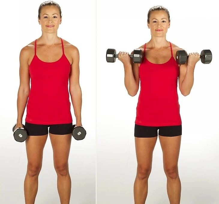 Для проработки трицепсов и бицепсов потребуются гантели весом 1-2 кг. Возьмите снаряды и встаньте ровно. Ноги расставьте на ширине плеч. Руки сгибайте поочередно или одновременно. Выполните по 20 повторов для каждой.