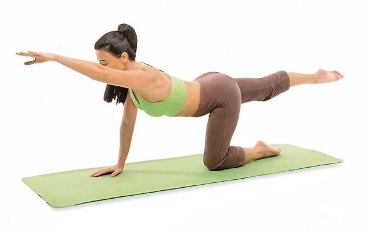 Для начала встаньте на четвереньки. Теперь вытяните правую ногу, удерживая ее прямой. Отводить в сторону или сгибать нельзя. Одновременно протяните вперед левую руку. Замрите в таком положении на несколько секунд.