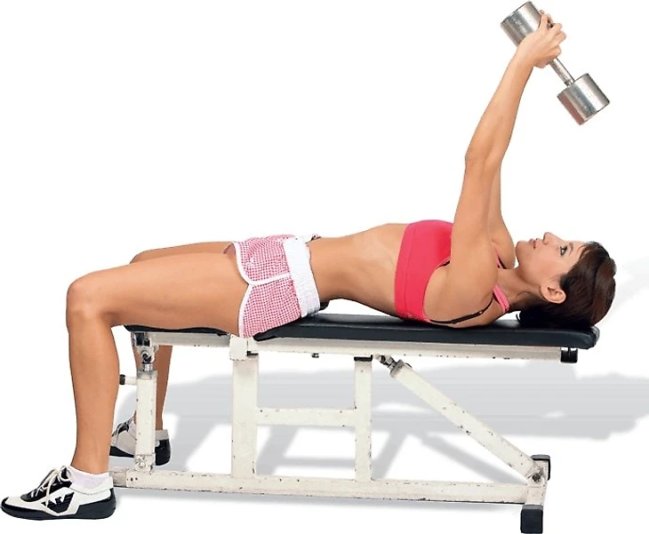 Чтобы выполнить данное упражнение, лягте на доску. Согните ноги в коленях и сделайте упор на них. На вытянутых руках удерживайте гантели. Медленно опускайте их назад (за голову) как можно ниже. Опуская груз, вдыхайте. Поднимая — выдыхайте. Рекомендуемое число повторов 12 в 4 подхода.