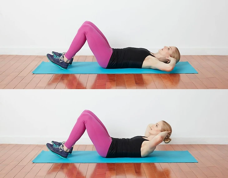 Лягте на пол, сгибая ноги в коленях. Ладони разместите на затылке не расставляйте стопы слишком широко друг от друга. Плавно поднимите верхнюю часть туловища, стараясь не отрывать от упорной поверхности поясницу. Повторите упражнение 30 раз в 3 подхода.
