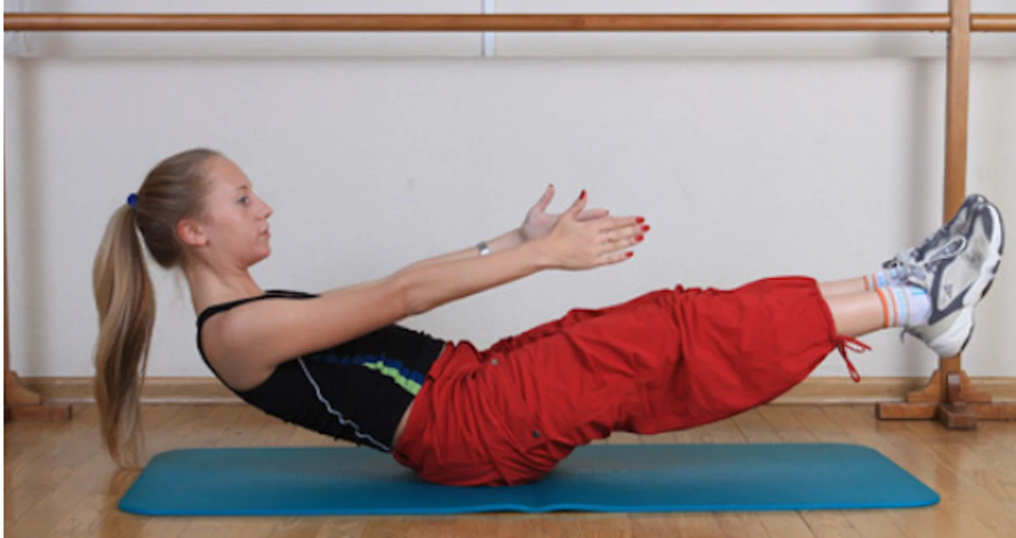 2. Уголок. Садимся на пол и максимально выпрямляем спину. Затем аккуратно отводим спину назад, образу угол в 45 градусов. Обратите внимание, что сидеть нужно на костях таза, не напрягая при этом копчик. Напрягаем мышцы пресса. Теперь отрываем ноги от пола силой пресса, выпрямляем их и поднимаем. Если сложно держать ноги в выпрямленном положении, согните их в коленях. Руки необходимо выпрямить и держать перед собой. Следите, чтобы спина располагалась строго в прямом положении.