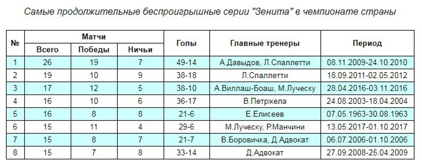 Беспроигрышная серия «Зенита» в чемпионате России, начатая ещё в мае при Мирче Луческу, прервалась во вчерашней игре с тульским «Арсеналом». Больше 5 месяцев петербуржцы не испытывали горечи поражений, добившись за это время 11 побед и лишь 4 раза сыграв вничью, забив 29 мячей и пропустив всего 6. И хотя эта 15-матчевая беспроигрышная серия даже близко не подобралась к рекордной, тем не менее она стала одной из самых продолжительных в клубной истории. За почти 80 лет выступлений в чемпионатах страны зенитовцы всего 5 раз добивались более высоких показателей, что, конечно же, позволяет назвать их нынешний результат большим успехом.