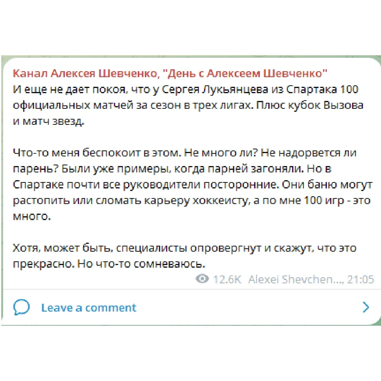 Известный журналист Алексей Шевченко озаботился здоровьем форварда Сергея Лукьянцева из МХК «Спартак». Шевченко написал в своем телеграме, что у Лукьянцева 100 с лишним матчей за сезон в трех лигах, а еще были Кубок Вызова и матч звезд, после чего поставил вопрос, а не надорвется ли парень?