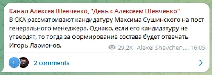 Журналист Алексей Шевченко сообщил, что СКА рассматривает на должность генерального менеджера Максима Сушинского. Если Сушинского не утвердят, то тогда за формирование состава будет отвечать новый главный тренер Игорь Ларионов.
