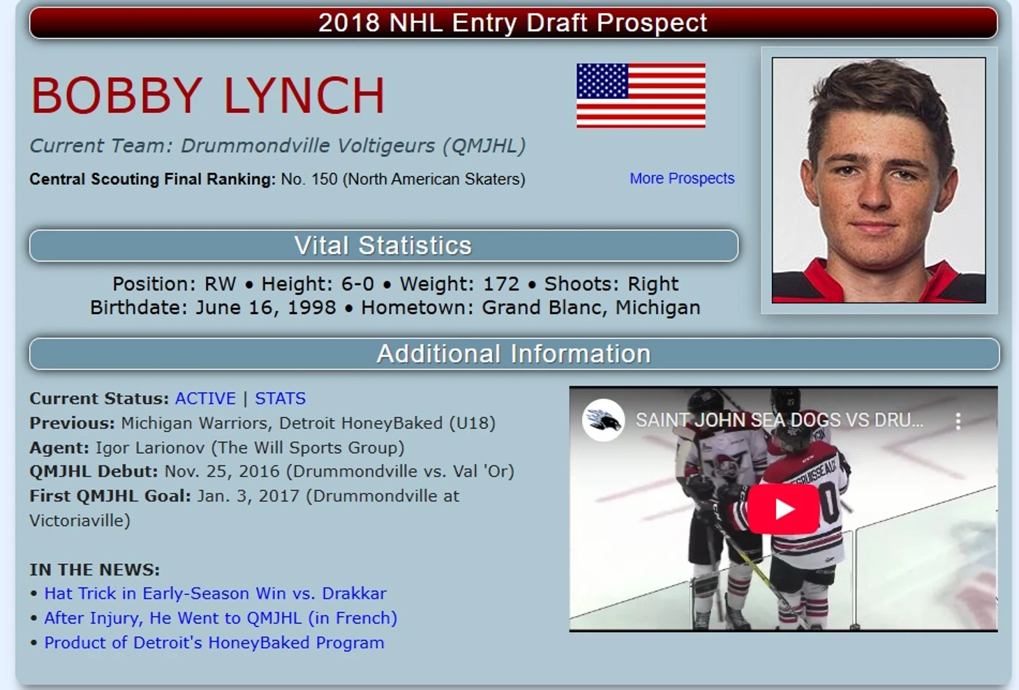 Агентом Линча был Ларионов-старший, а перед драфтом НХЛ 2018 года этот игрок котировался на 150 месте среди североамериканских хоккеистов. В Интернете даже есть рекламный ролик с ним, в котором Линч дает интервью девушке. В преддрафтовый сезон 2017/2018 годов Линч набрал 67 очков в 67 матчах за Drummondville Voltigeurs из QMJHL, но так никого и не заинтересовал.
