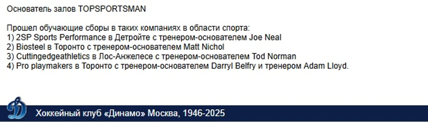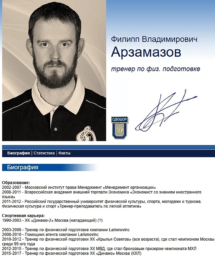 В резюме Арзамазова, опубликованном в телеграм-канале СКА, указано, что он имеет «сертификаты ведущих мировых компаний в области физической подготовки спортсменов в Торонто, Детройте, Лос-Анджелесе и Англии». А вот на его «динамовской» странице рассказано, о чем здесь идет речь.