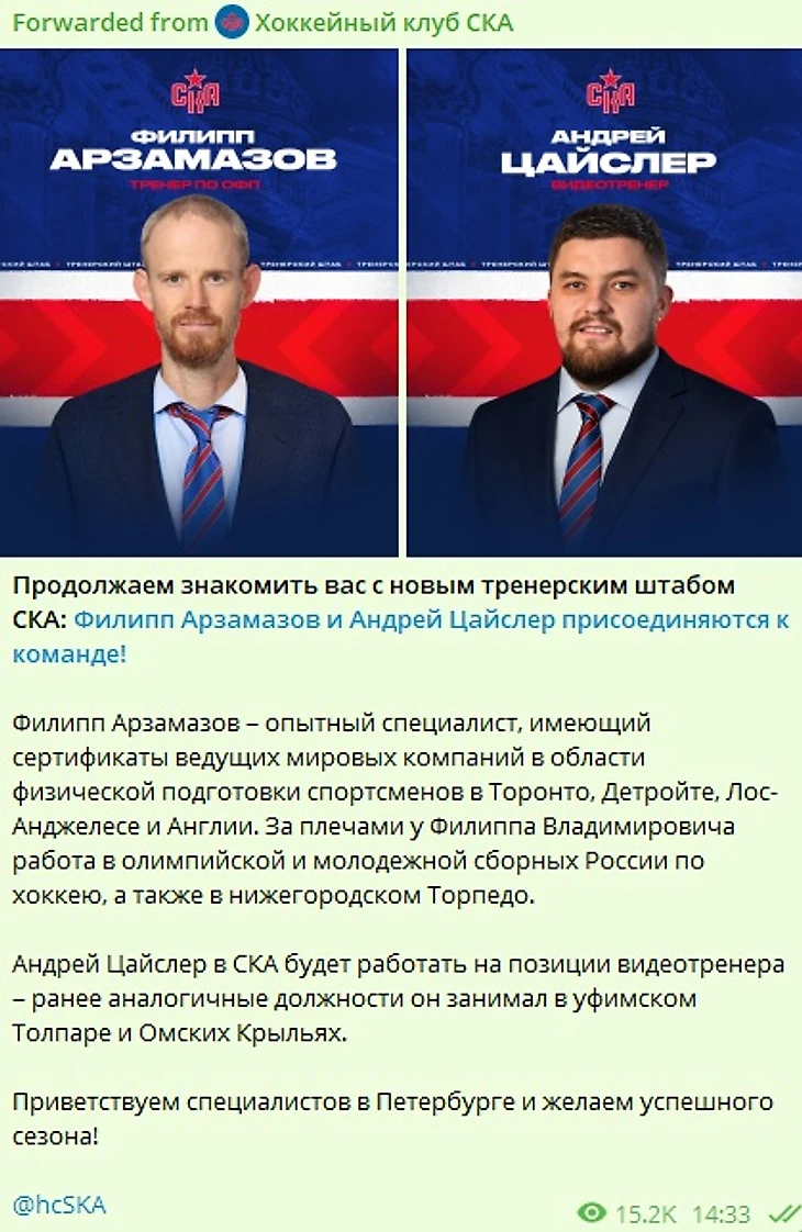 В СКА продолжают происходить интересные события. Тренером по общей физической подготовке петербургских армейцев назначен Филипп Арзамазов, который является старым соратником нового главного тренера клуба Игоря Ларионова, а по некоторым данным и его родственником.