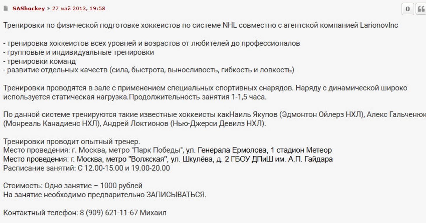 В конце десятых годов Ларионов решил возвратиться в российский хоккей. Полагаю, что это связно с тем, что его занятия вроде агентской деятельности и торговли вином не принесли желаемого результата, а вот в России у Ларионова остался авторитет, который можно монетизировать.