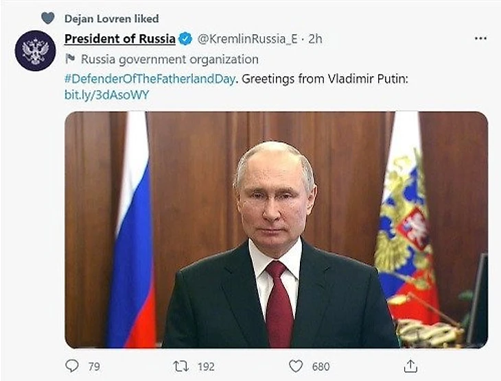 Защитник «Зенита» Деян Ловрен лайкнул поздравления президента Российской Федерации Владимира Путина с Днем защитника Отечества.