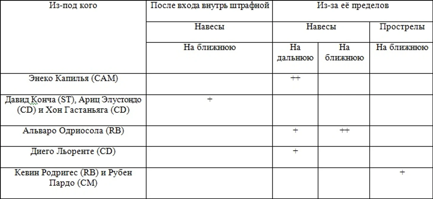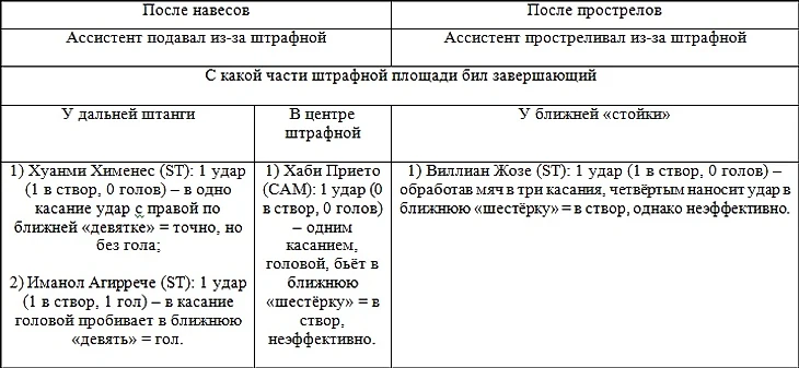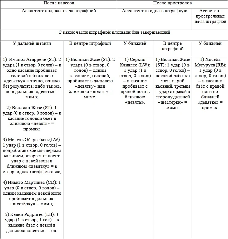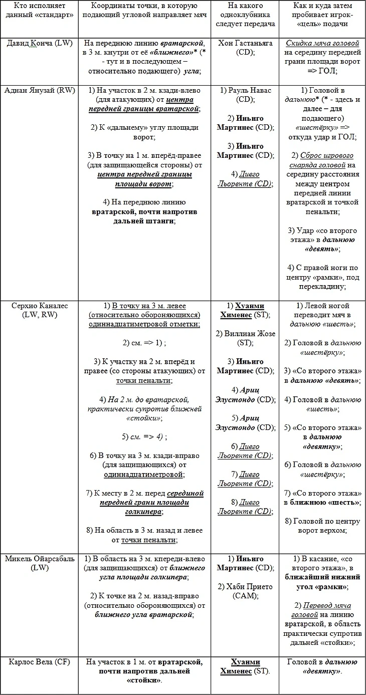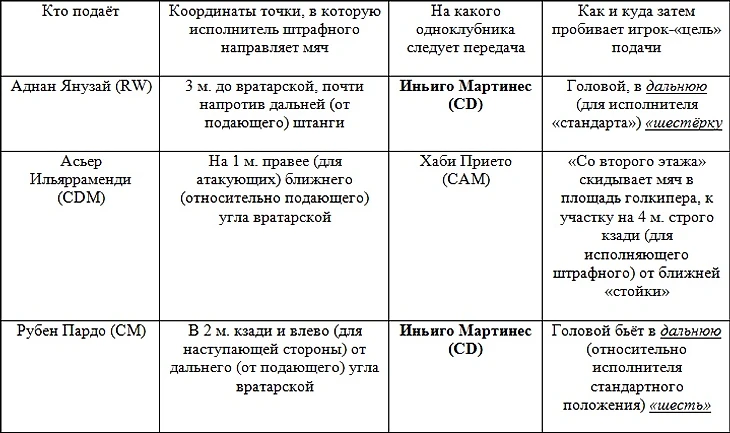 Довольно неожиданно для команды из Испании чрезвычайно полезным и искусно проделываемым элементом угроз чужим воротам являются корнеры. Вы только вдумайтесь: практически каждый третий доведённый до удара розыгрыш углового обеспечивает баскам изменение счёта на табло в свою пользу! Конечно же, всё это неспроста, а подкрепляется упорной отработкой данного типа «стандартов». Что включает в себя правильное и хитрое расположение «бело-голубых» как внутри штрафной площадки (в количество 5-6 человек), так и за её пределами (около 1-2). Не менее ключевым аспектом выступают замыслы исполнителей корнера, живых направлений их подач и дальнейшие ударные деяния последних. Подробности этого отражены в таковой таблице: