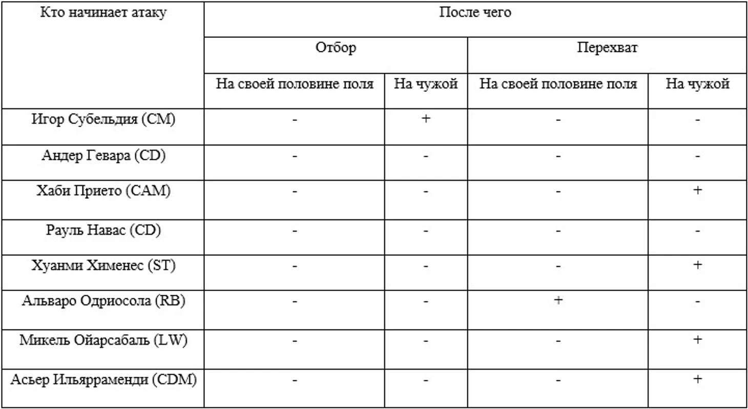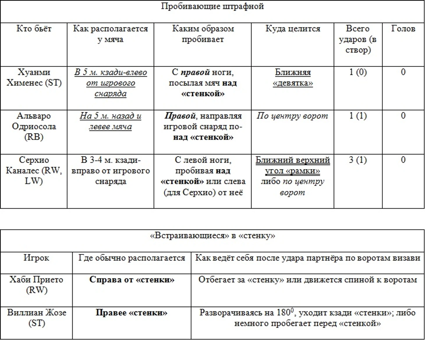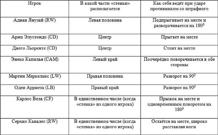 В эти моменты мини-«стенку» образует один человек – Хуанми либо Ильярраменди. Оба после кросса противника немного подпрыгивают на месте, попутно разворачиваясь в стороны. Хименес – на 90 градусов, Асьер – на все 180. Прочие их одноклубники всем скопом дислоцируются в штрафной площади или за ней. Опять же, в зависимости от дальности нахождения соперника с мячом до «рамки» подопечных Эусебио Сакристана. По аналогии с всё теми же корнерами каждый футболист «Сосьедада» знает свои функции, задания и манёвры, которые оговорены с тренерским штабом заблаговременно. Приоткрыть завесу данной тайны поможет следующая сводка: