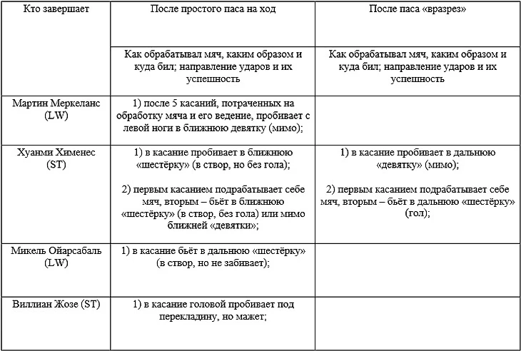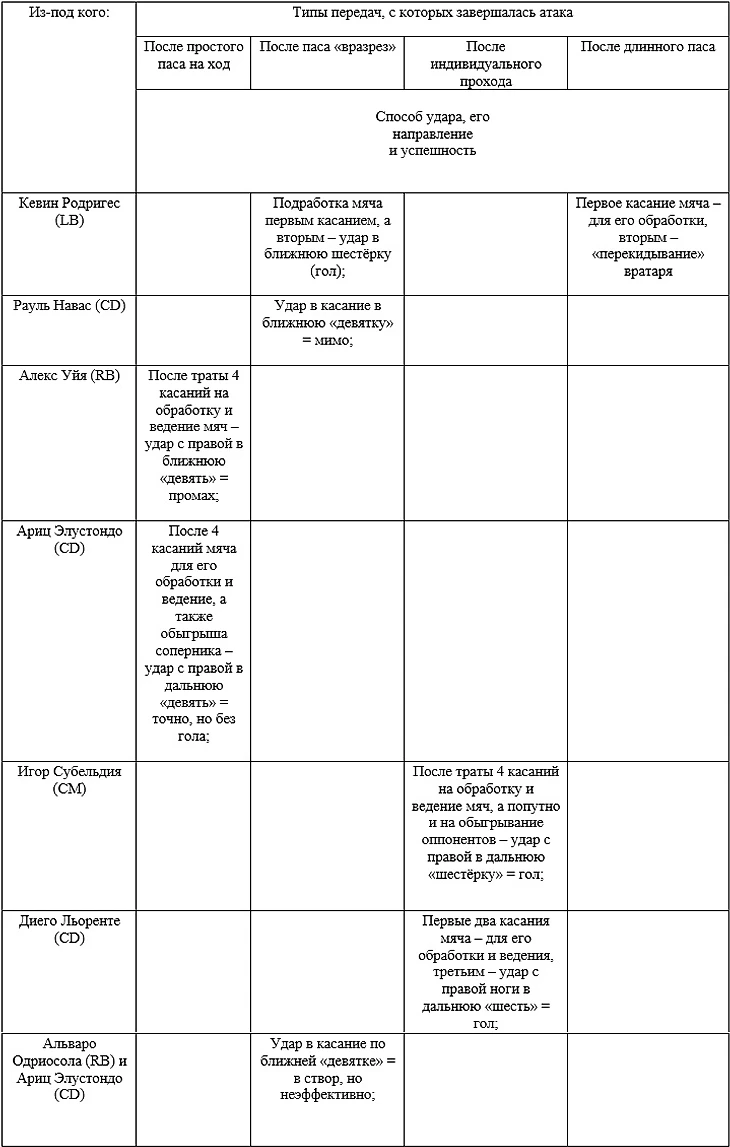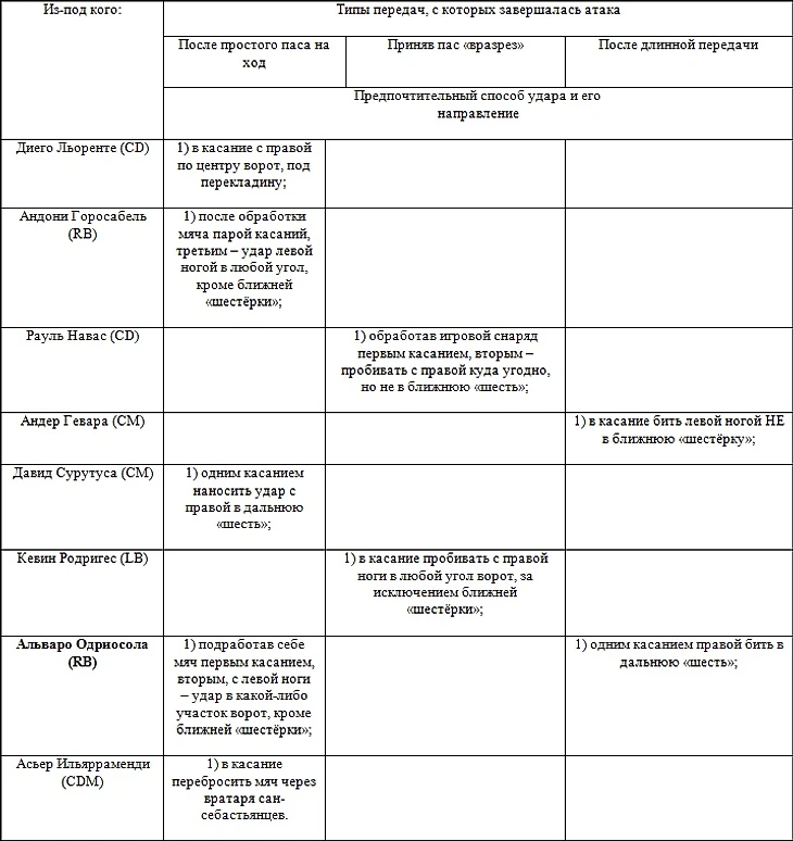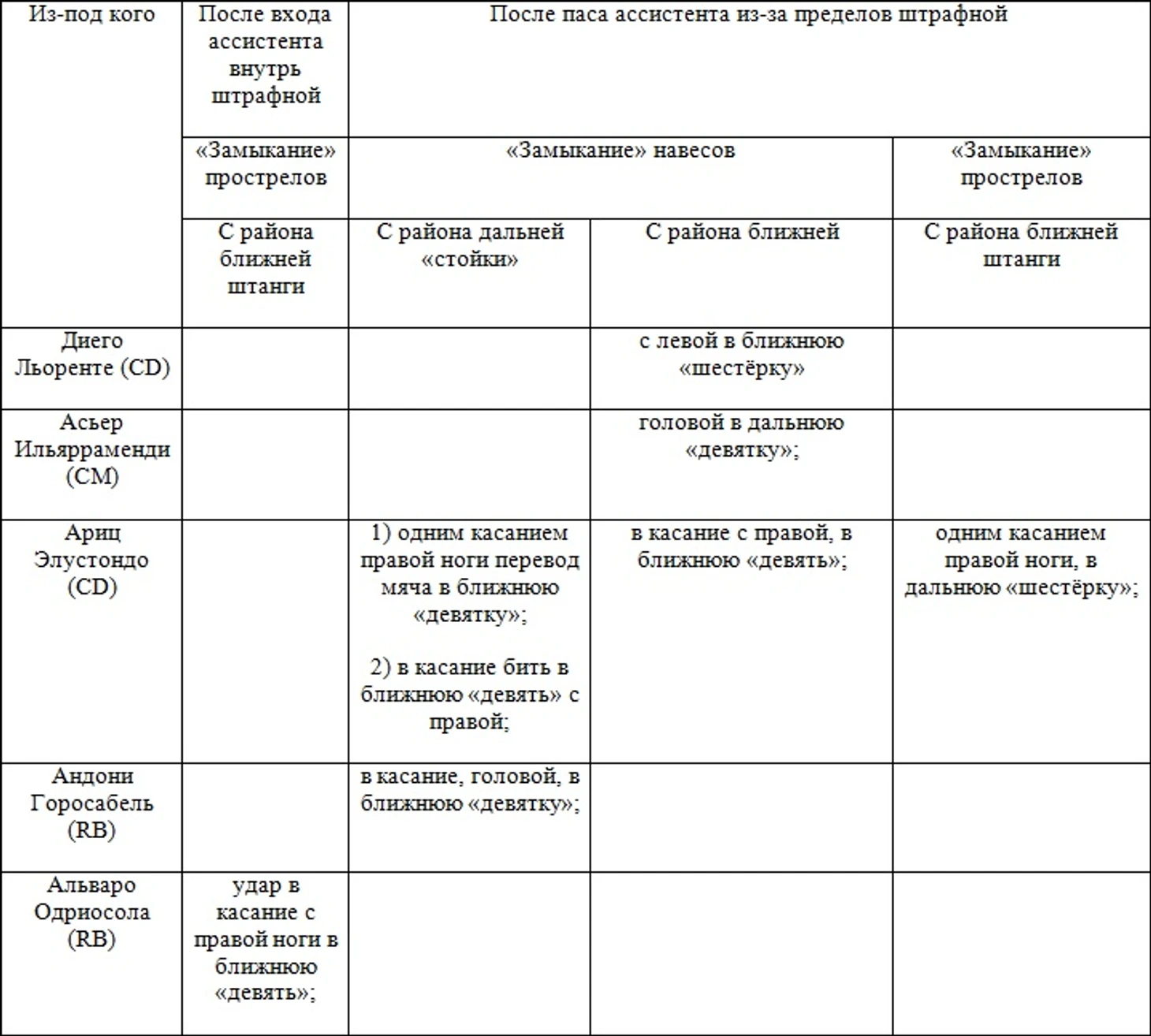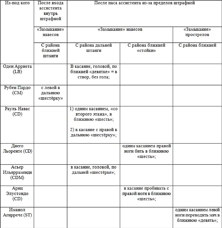 А при действиях против Мартина следует не дожидаться шанса на внедрение в указанную площадку, сходу делая кросс в центр штрафной. Из этой области под опекой Д. Льоренте максимум парой касаний надо переправлять игровой снаряд в отдалённую «шестёрку». Навесы на дальнюю «стойку» лучше превращать в удары «со второго этажа» по ближней «девять». Особенно если в оппонентах А. Элустондо. Несущие в изучаемых эпизодах меньший эффект переводы к ближайшей части каркаса ворот стоит трансформировать в удар по схеме, целиком аналогичной той, что касается немного ранее описанного «выстрела» из «сердцевины» штрафной площадки.