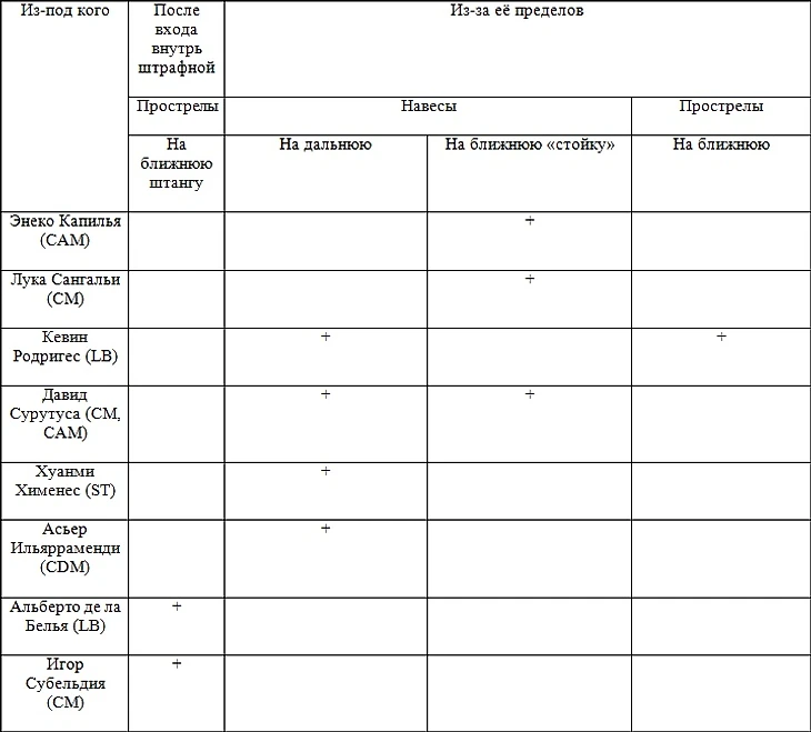 Относительно сопоставимой с угловыми по частоте применения и эффекту в рядах «Сосьедада» значится другая разновидность неспешных наступлений – по срединному пути. Правда, только меньше пятой доли оных пополняет копилку голевых свершений подопечных Сакристана. Здесь тоже есть свои герои: как в свете тонких пасов, так и хладнокровных завершений. Всё о первых и вторых Вы можете выяснить благодаря расположенной далее сводке: