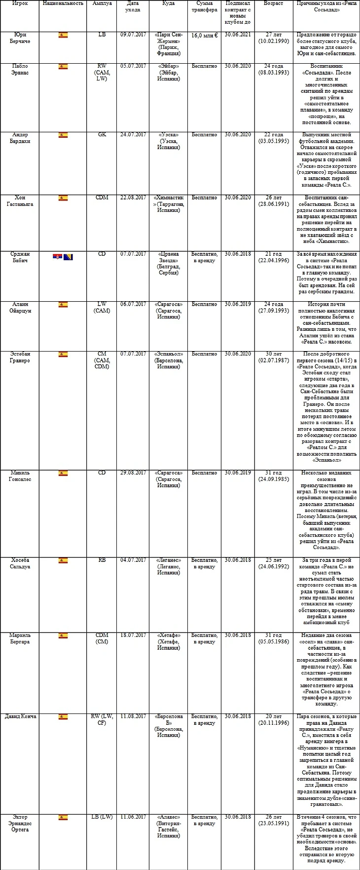 Речь о выкупленных вингере Янузае (за 8,5 млн €) да стоппере Д. Льоренте (7 000 000 евро) у «МЮ» и «галактикос» соответственно. Как ни парадоксально, но куда внушительнее оказался список игроков «на выход» из стана басков. Правда, стоит заметить, что существенной потерей явилась лишь продажа некогда железно основного левого латераля сан-себастьянцев Ю. Берчиче. Впрочем, судите сами: