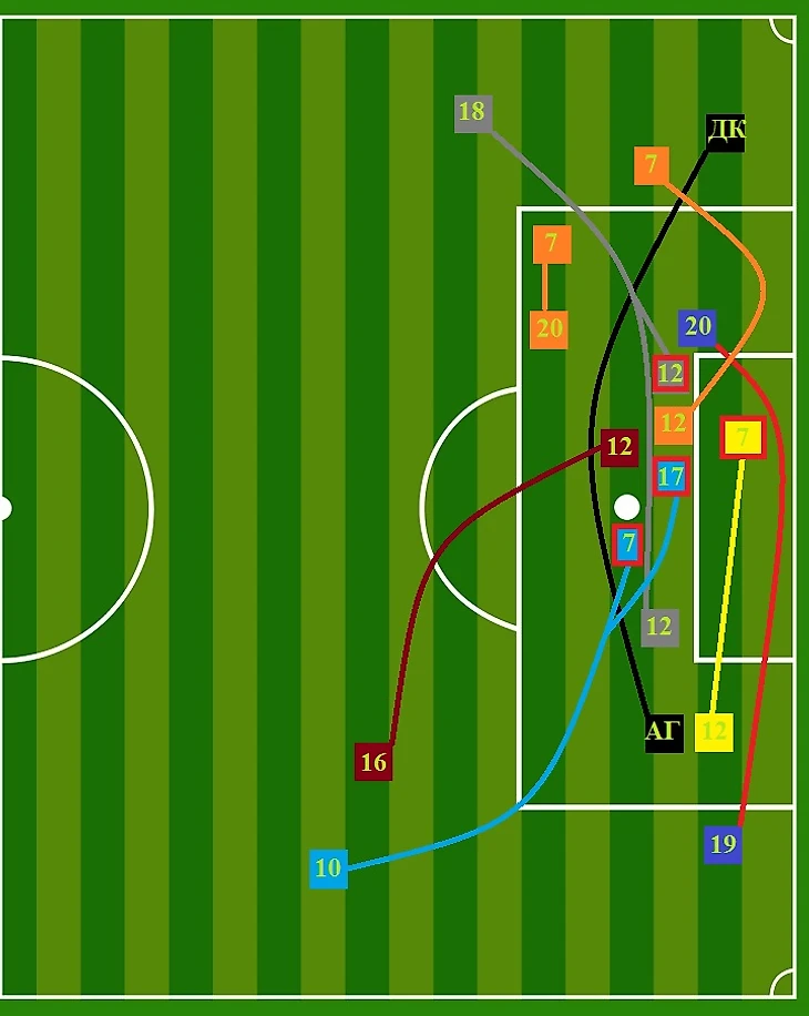 Условные обозначения: 1) квадраты – точки, с которых отдаются передачи или наносится удар; 2) числами и буквами указаны футболисты «бело-голубых» (7 – Хуанми; 10 – Х. Прието; 12 – В. Жозе; 16 – Серхио Каналес; 17 – Давид Сурутуса; 18 – Микель Ойарсабаль; 19 – А. Одриосола; 20 – К. Родригес; АГ – А. Горосабель, ДК – Д. Конча); 3) дугообразными стрелками – навесы, прямыми – прострелы; 4) цветом – связь пасующих и бьющих игроков в рамках одной комбинации; 5) красная окантовка – завершение атаки голом.