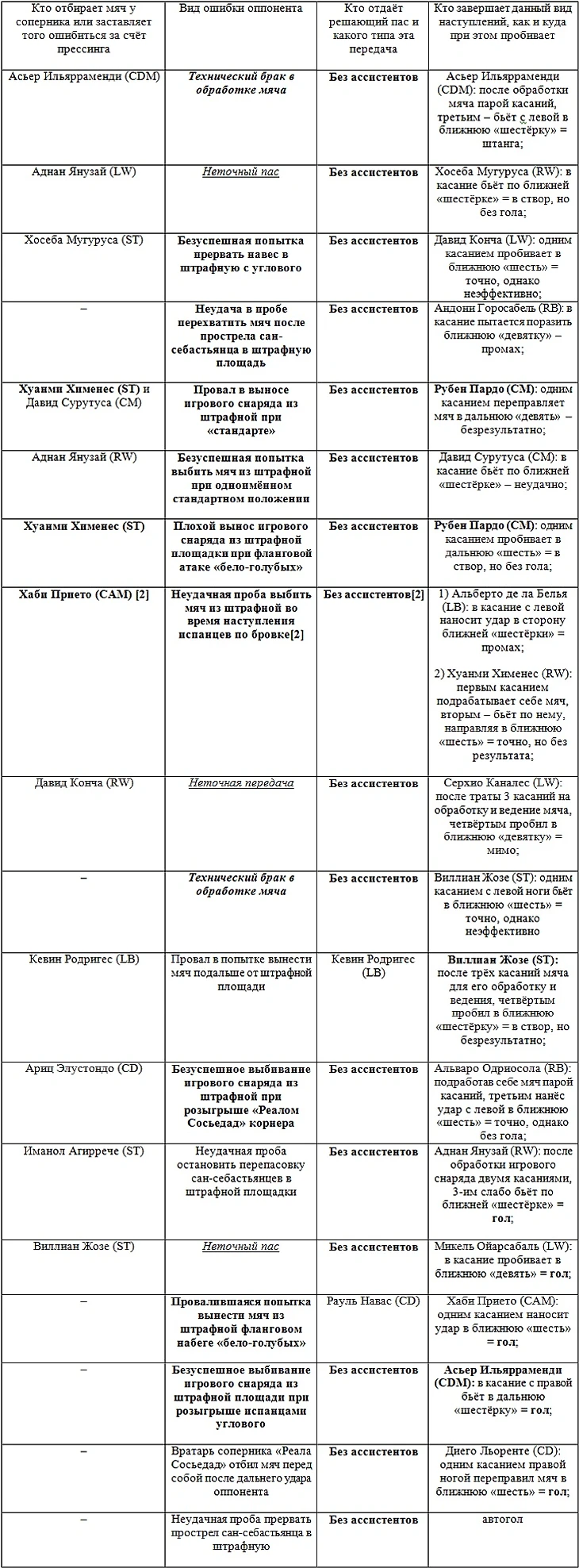 Однако нападающие коллектива из Доностии частенько бывают не только прямолинейными, но и весьма проворными. В частности, это позволяет вынуждать оппонентов ошибаться, бдительно подстерегать такие эпизоды и грамотно ими распоряжаться. Недаром едва ли не треть подобных моментов приводит к взятию испанцами владений визави. Далее тщательно описываются все случаи наступлений баскской команды, связанные с фатальными оплошностями соперника под тем или иным предлогом: