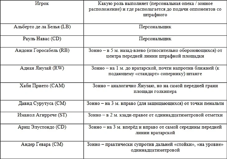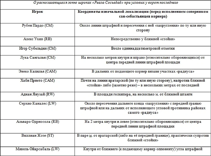 При этом важно заметить, что среди футболистов из Доностии есть чёткое разделение на тех, кто действует при корнерах противника персонально по визави, и отвечающих за «порядок» в избранных ключевых зонах штрафной. К первой группе относятся: Ариц Элустондо, Одеи Арриета, Диего Льоренте, М. Меркеланс, Сурутуса, А. Горосабель, Андер Гевара, Хон Гастаньяга, Альберто де ла Белья, К. Родригес, Р. Навас и временами – Альваро Одриосола. «Прикреплены» же к определённым местам Р. Пардо, А. Ухия, Субельдия, Л. Сангальи, Э. Капилья, Хаби Прието, Янузай, Серхио Каналес, В. Жозе, Асьер Ильярраменди, Ойарсабаль, а также, порой – Одриосола.
