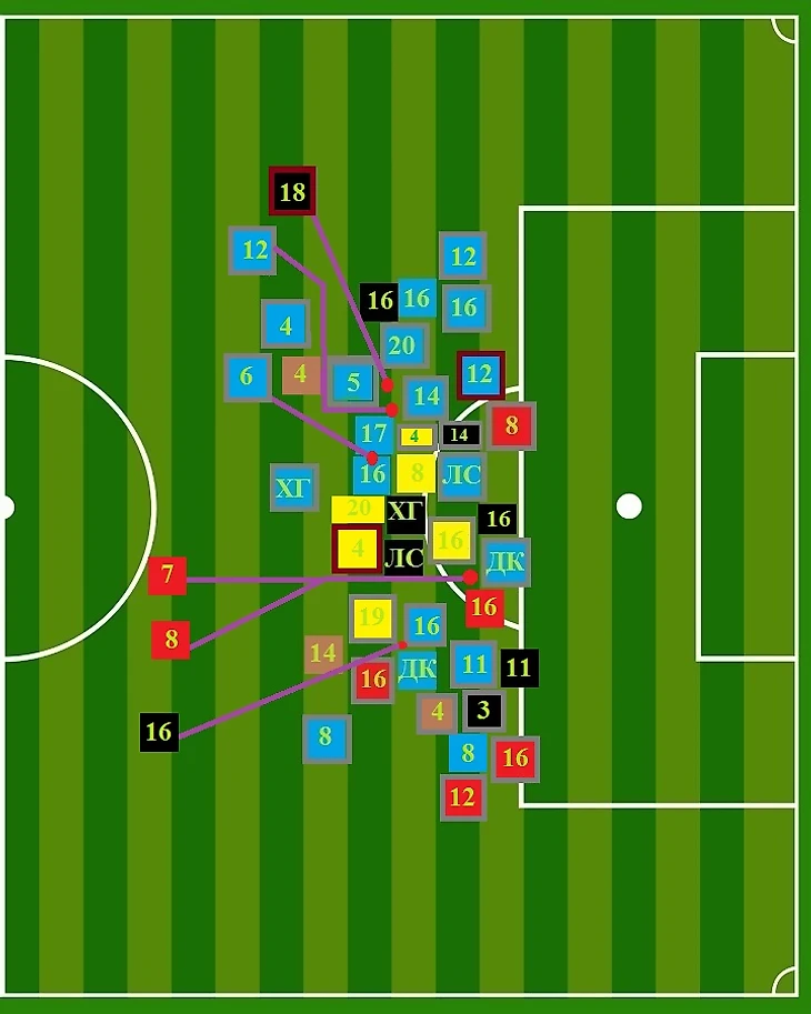Примечания: 1) квадраты отображают точки на поле, с которых «бело-голубые» били издали; 2) номерами и буквами обозначены футболисты (3 – Диего Льоренте; 4 – Ильярраменди; 5 – Субельдия; 6 – Иньиго Мартинес; 7 – Х. Хименес; 8 – Янузай; 11 – Карлос Вела; 12 – Виллиан Жозе; 14 – Р. Пардо; 16 – С. Каналес; 17 – Д. Сурутуса; 18 – Микель Ойарсабаль; 19 – Альваро Одриосола; 20 – Кевин Родригес; символами алфавита – игроки, ныне находящиеся не в «Сосьедаде»: ДК – Давид Конча; ХГ – Хон Гастаньяга; ЛС – Лука Сангальи); 3) цветом указан вид ситуаций, при которых баски пробивают из-за штрафной (голубой – «позиционка»; чёрный – после оплошностей противника; красный – встречные атаки; жёлтый – подбор на «стандарте»; светло-коричневый – розыгрыш стандартных положений); 4) серая окантовка квадратов – удар пришёлся в створ ворот визави, бордовая – обернулся голом.