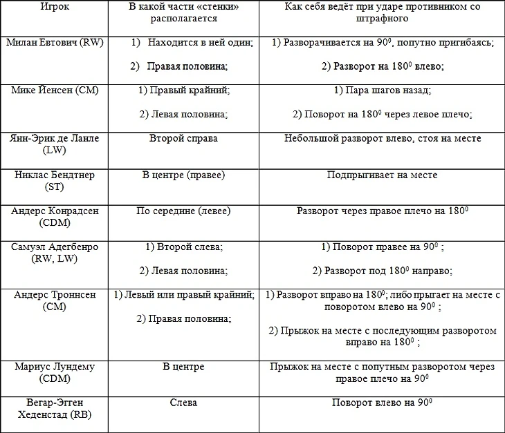 Пробивать же изучаемый «стандарт» предпочтительнее в дальние углы «рамки» норвежцев, направляя мяч в обход «стенки» любым удобным способом. Численное распределение «троллей» относительно расположения в штрафной и за её пределами аналогично таковому при корнерах у их владений. Здесь также превалирует формула «9+1», иногда с небольшими, единичными, отклонениями в ту или иную сторону. Детализация нахождения подопечных Коре Ингебригтсена вкупе с их движениями перед и впоследствии пробития оппонентами штрафного приведена далее: