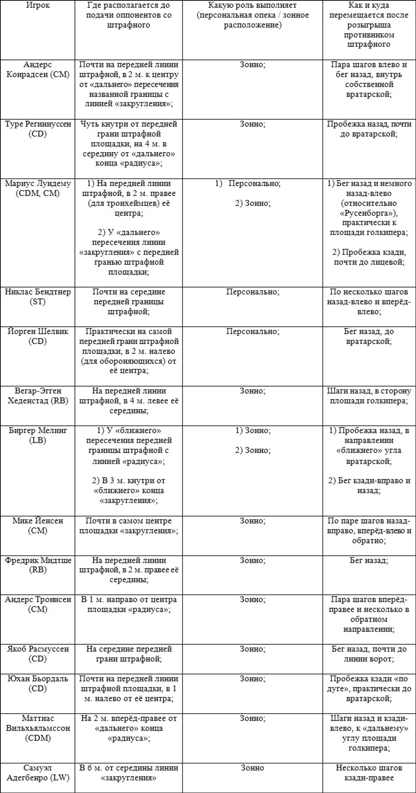 После чего стоит посылать мяч в практически любую часть ворот, однако лучше не рассматривать притом дальнюю «девятку». Перед подачами визави своих штрафных стражи ворот тронхеймцев отряжают в мнимую «стенку» только одного из партнёров. Преимущественно ими в итоге являются кто-нибудь из вингеров: Самуэл Адегбенро или Янн-Эрик де Ланле. Первый при ударе соперника «с места» делает шаг ему навстречу, подпрыгивает, разворачиваясь попутно вправо на 180 градусов.