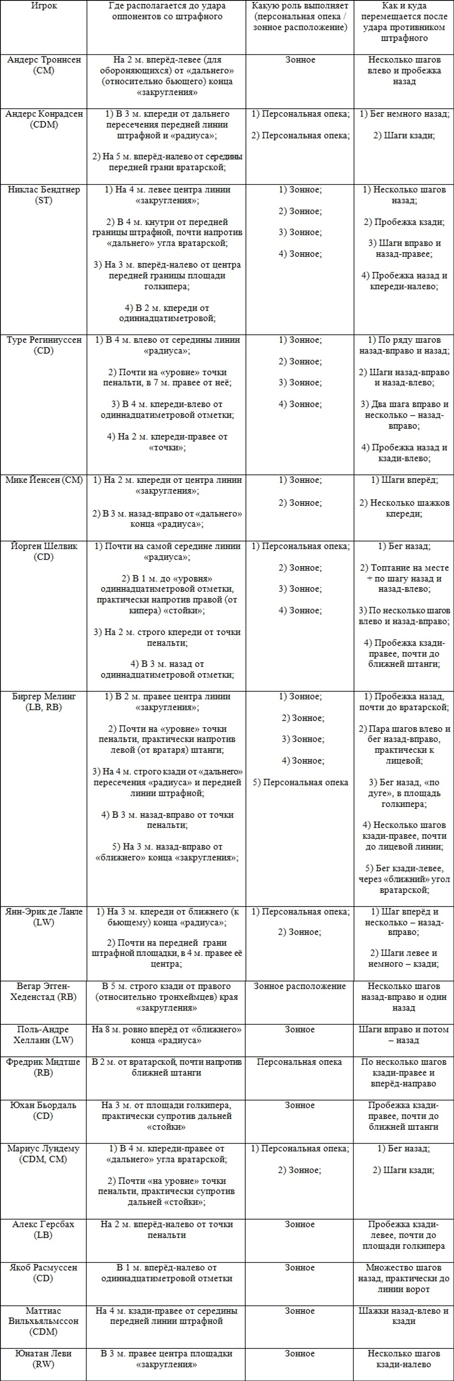 Янн-Эрик в аналогичных моментах сразу вращается влево под углом два раза меньше, чем нигериец. Затем де Ланле просто движется кпереди. Прочие футболисты норвежского клуба тем временем заранее предусмотренным образом становятся по обе стороны от передней границы штрафной площадки. Кнутри от неё, как правило, находятся трое «чёрно-белых», а наоборот – около пяти. Естественно, что все они в любом случае помимо предварительно заданных локализаций имеют и обговоренные направления последующих перемещений. Подробности всех этих нюансов растолковываются ниже: