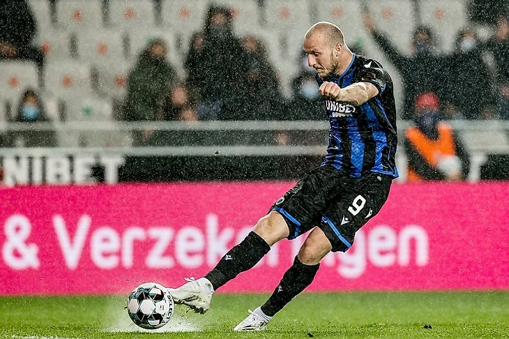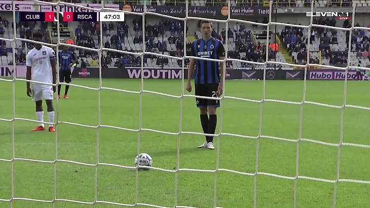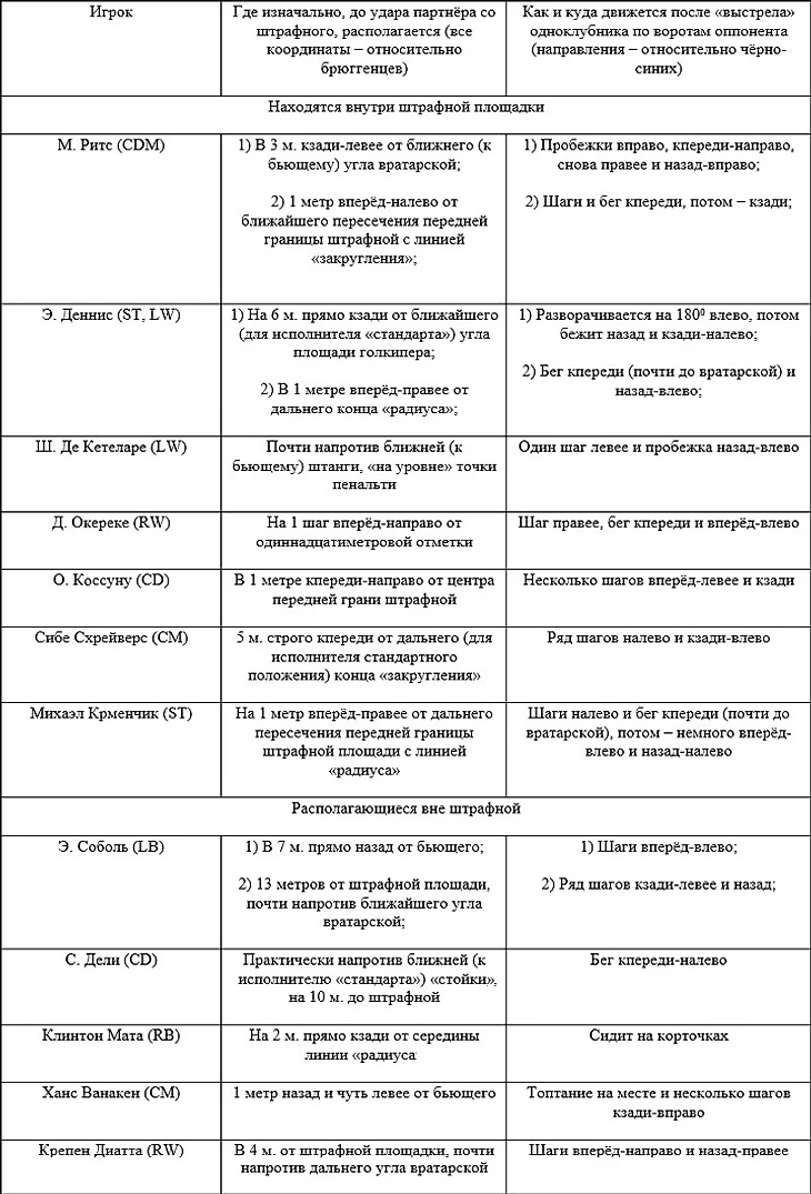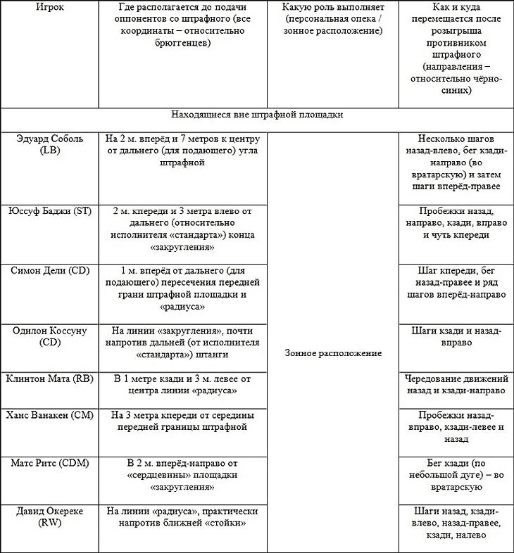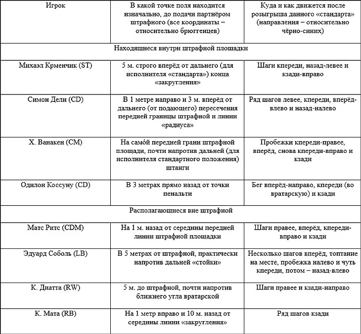 Несколько хуже обстоят дела у бельгийцев с теми штрафными, которые игроки Филиппа Клемана пробуют разыгрывать. Только 40% таковых заканчиваются ударами, а о голах речь в данных ситуациях не идёт вовсе. У мяча тогда становятся 1-2 брюггенца, среди коих обязательно есть Руд Вормер, как правило, производящий подачу в область на три метра кзади от дальнего (для хавбека) угла вратарской, на Крменчика. Чех затем бьёт в касание с левой мимо отдалённой «девять». Прочие чёрно-синие тем временем по четыре человека располагаются кнутри и снаружи от границ штрафной площадки. Конкретнее эти локации и следующие за ними перемещения поясняются здесь: